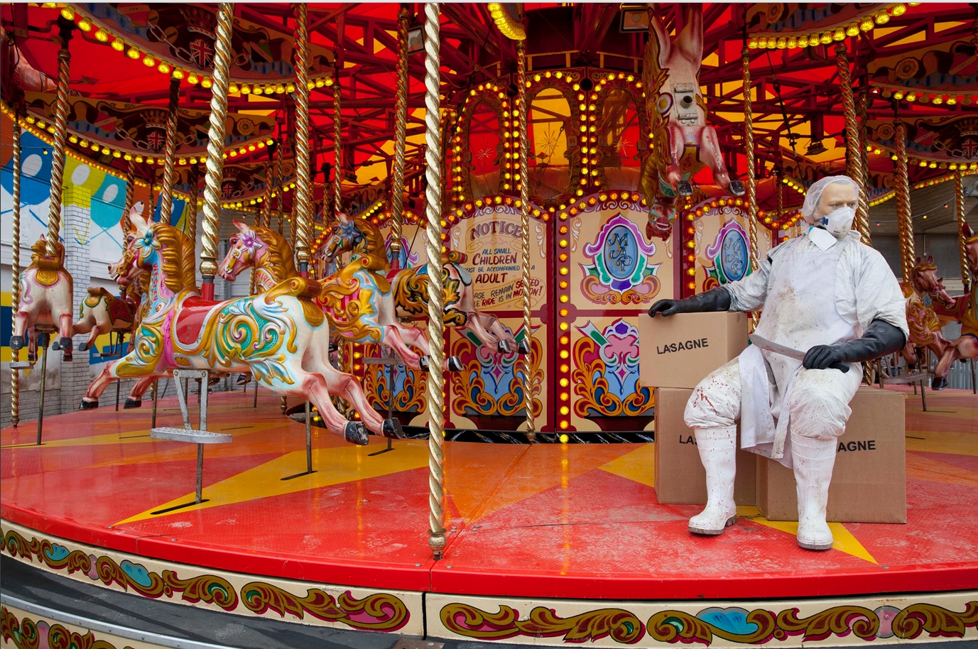 旋轉馬車上坐著屠夫,看他把那些馬都給宰了。這樣的Merry-go-round應該沒人敢搭吧, 那些堆疊的紙箱上面寫著Lasgne (義大利文),看來是木馬千層麵吧。 |
